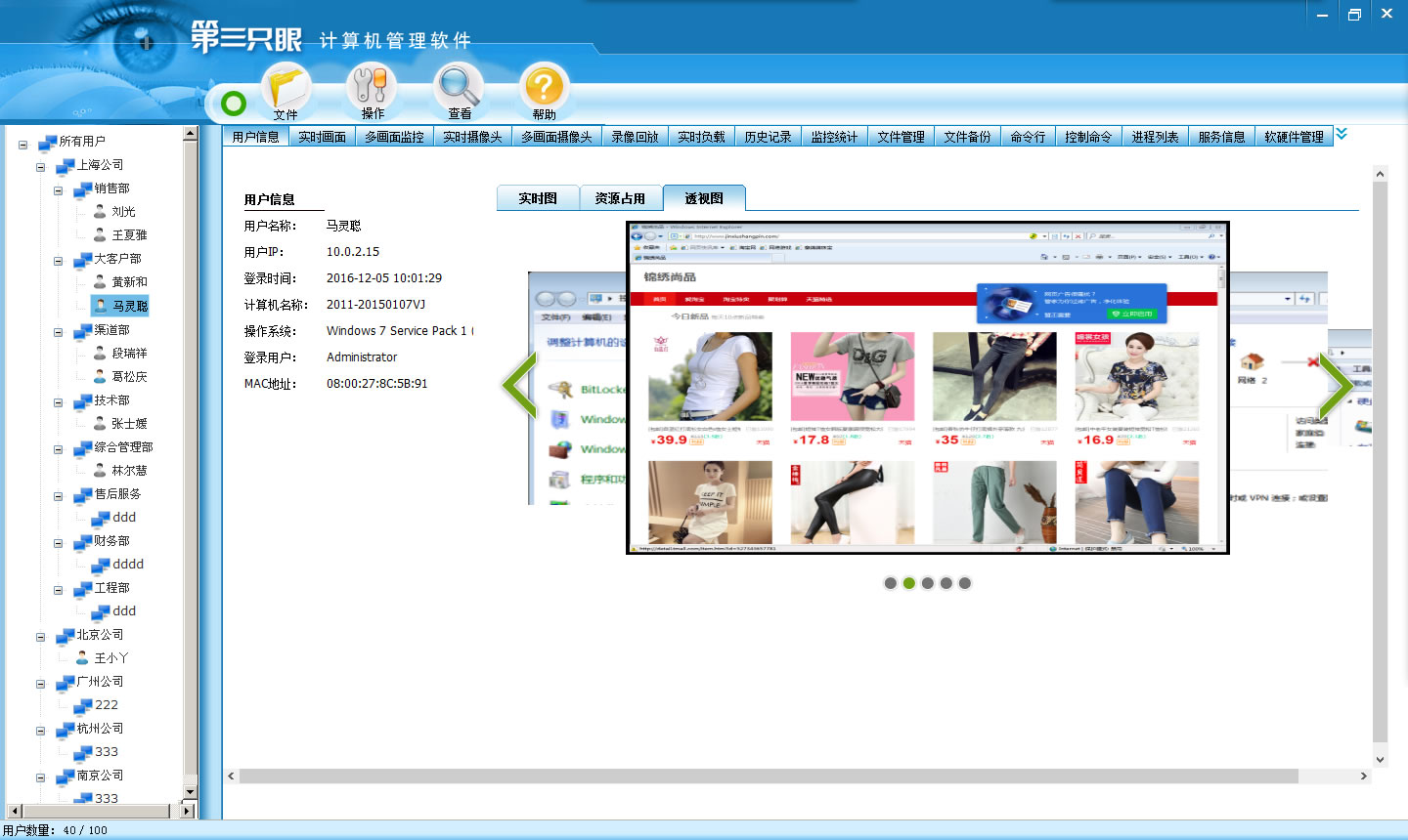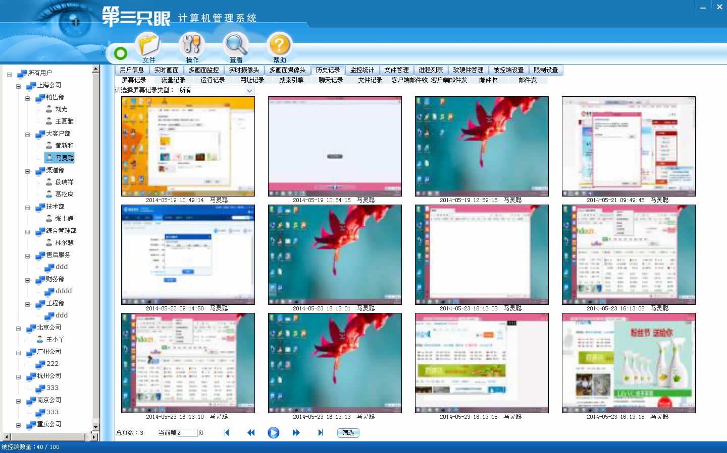 1、三只眼软件有哪些基本的功能?答:第三只眼可以管控到被管控者从开机以后的一切操作,包括上网,聊天(包括内容,包括msn,qq,雅虎等),收发邮件等,以及对文件的操作管控,拷贝带走了什么文件都可以了如指掌,另外,还支持多达16画面的多画面实时画面,甚至支持实时的远程控制,还可以对员工插入移动硬盘或者拷贝走文件时向管理者及时报警,让管理者及时知晓,及时获悉员工的恶意行为。总之,被控端计算机上的行为,管理者尽在掌控。