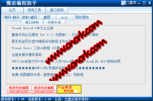 微凉编程助手是一款常用工具,提供一个常用的工具,屏幕抓图,在线翻译,编码转换,窗口探测,超强的易语言代码生成,为易语言编程更方便的取得句柄,还可以自定义皮肤。