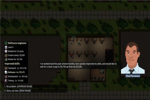 有些意思的一款游戏,从画面效果上看起来并没有太值得吸引眼球的地方,选用的经典复古式像素级画风。倒是在玩法方面有些让人捉摸不透的感觉,既是一种游戏变成模拟游戏又是一种模拟市场经营类游戏。两者相对来说是同时进行的,所以对于玩家们来说,可能就真的需要将自己放在一个工作室老板的位置上,同时操许多份心了。