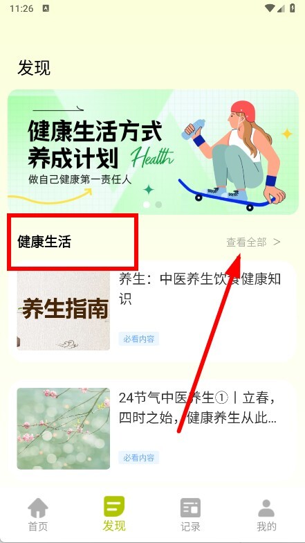 2. 在发现页面的健康生活板块处,点击“查看全部”按钮。