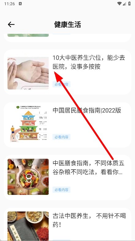3、当进入健康生活列表页面后,挑选目标内容并进行点击操作。