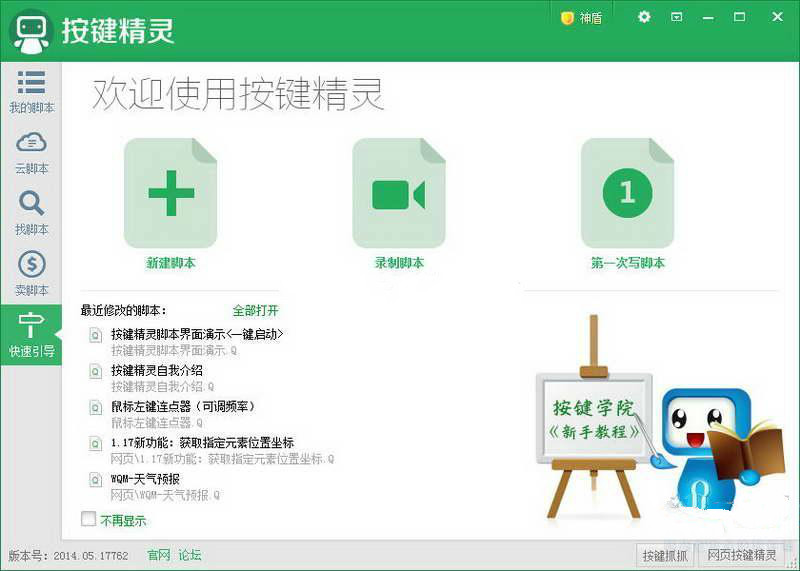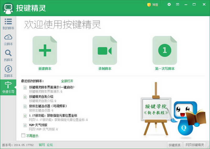 接下来我们就会看到按键精灵的主界面,点击程序界面上方的录制按钮,这里的录制顾名思义录制的是用户要反复经常进行一些日常操作,比如打开QQ,登录微博等,通过按键精灵把操作录制下来以后就可以一键轻松执行这些步骤繁琐的操作了