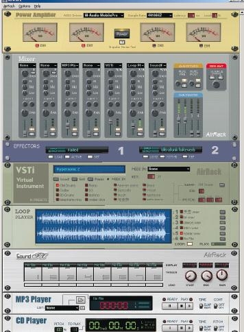 4、启动玉米调音台软件,在asio接口模块选择asio驱动,打开模块电源,在玉米软件设计自己的设备连接(asio模块的第一输入通道接入调音台音轨),播放千千,看调音台输入有无音频信号,保证信号流入正常后,即可扫描加载各种VST效果器并组合,接入8路调音台音轨进行混音输出。