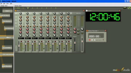 在玉米调音台的设计视图栏目里,我们右键可以看到我们可以操作的各个项目。像上图我们创建调音台1,音频矩阵1,asio音频接口。打开玉米右面的设备视图,我们就可以看见下图这个界面了!像上图一样的连线,这样调音台就接上了,出现黄色音条,这个调音太就可以工作了。我们可以播放千千静听,这样我们就可以看见调音台彩条在闪动!可以进行调音工作了!