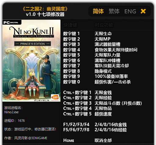 数字键 1 - 无限生命数字键 2 - 无限MP