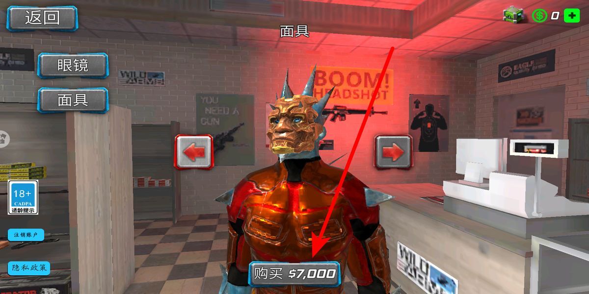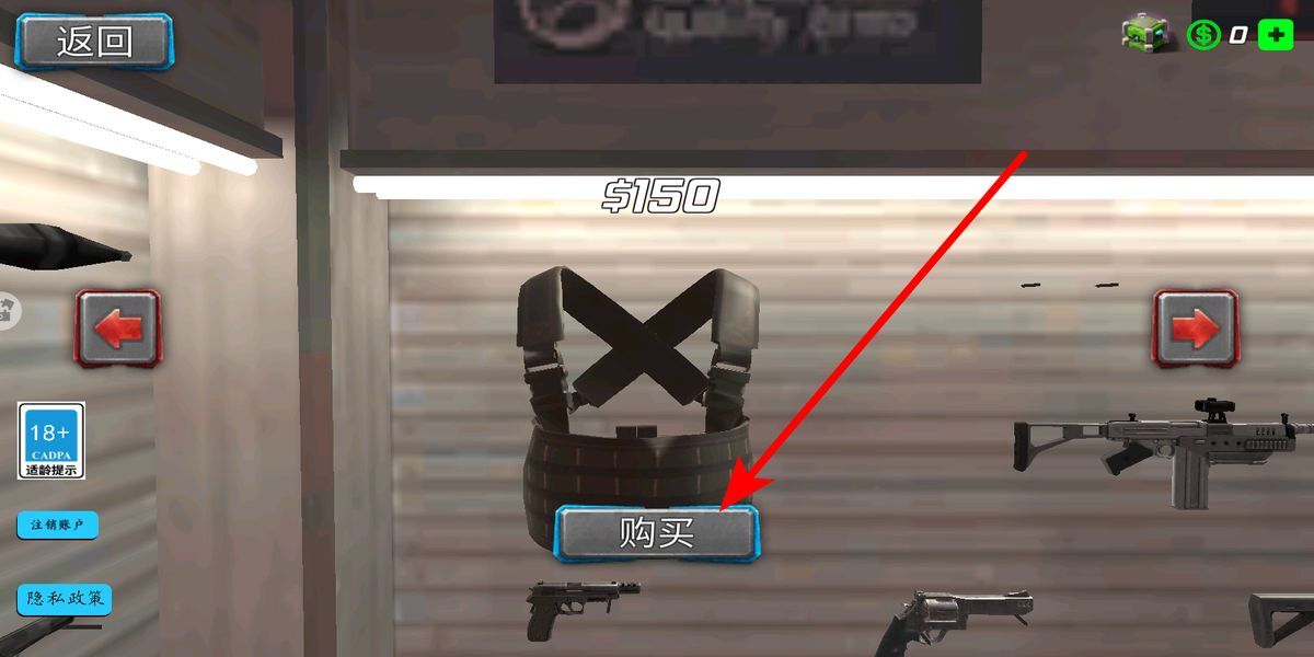 2、武器采购流程:进入武器界面后,可浏览枪械背带等各类道具;选中想要的目标物品,点击购买按钮,消耗对应货币即可获取该装备,从而提升角色在战斗中的续航或攻击能力。