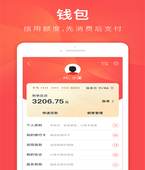 极速开卡:简单数步即可开通小拼卡,享受专属钱包额度;循环额度:1000-5000元消费循环额度,先消费,出账后再还款,最长40天;
