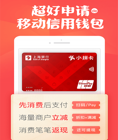 极速开通小拼卡app,支持银联云闪付、可刷二维码可绑PAY,先消费后还款,海量商家优惠、 万千返现权益。【软件特点】