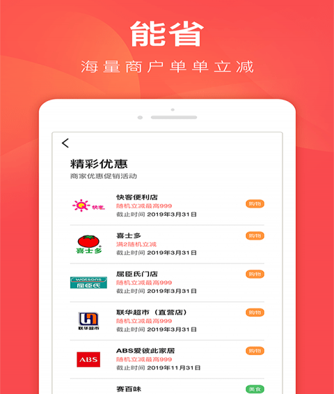 商家优惠:覆盖线上线下海量商户,消费随机返现、首笔消费返现、还款返现等活动等你来,更支持云闪付优惠活动;