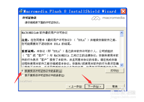 3、点一下“ 我愿意接受该许可证协议中的条款”前面的圈圈,再点“下一步”。
