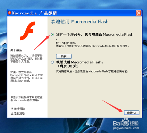 12、打开软件后,软件就提示要激活软件,选择我有一个序列号那个选项,然后点”继续“。