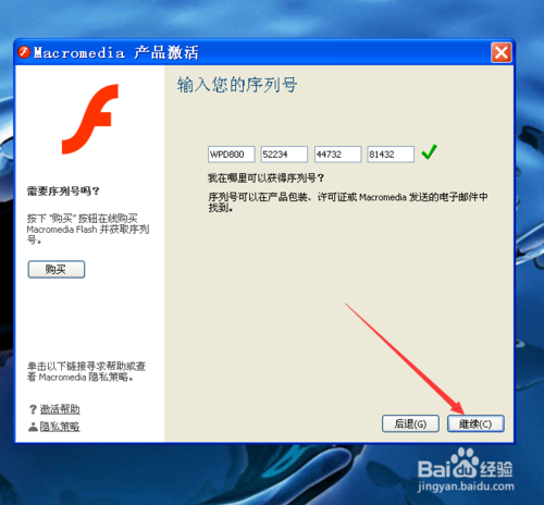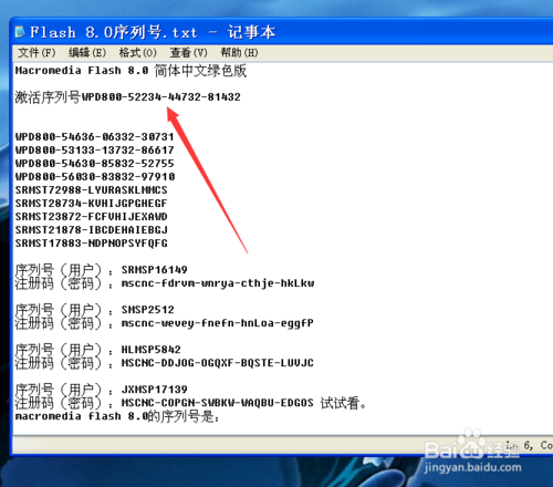 13、打开自己在百度上搜索到的官方中文版Macromedia Flash 8.0 软件激活的序列号, 我选择的激活序列号是:WPD800-52234-44732-81432 。