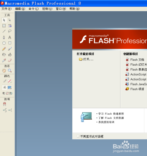 16、接着,Macromedia Flash 8.0 软件就开始正式进入软件的工作页面。