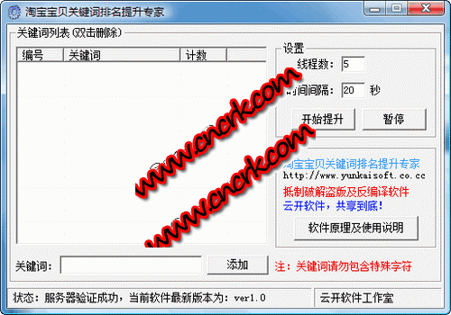 淘宝宝贝关键词排名提升专家是一款为淘宝卖家开发的用于快速提升关键词在淘宝搜索中的地位,让卖家的关键词进入智能搜索提示下拉列表,以及淘宝关键的相关搜索中,让卖家设定的关键词在淘宝搜索中出现,使买家更容易发现卖家的产品,使卖家的产品快速有效地展现在买家眼前,增加曝光率,提升知名度,大大加强了产品的推广效果,是一款不可多得的卖家推广工具。