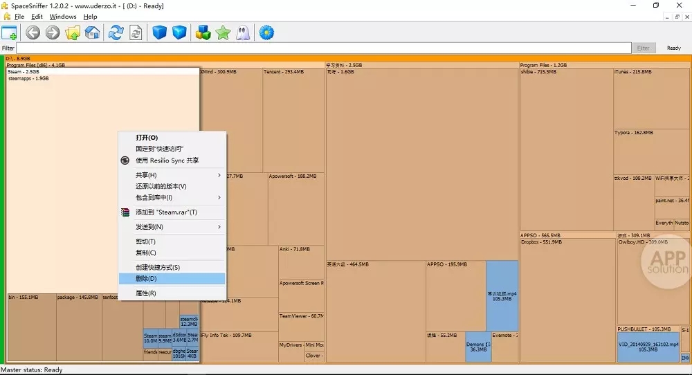 SpaceSniffer可以很直观的以区块,数字和颜色来显示硬盘上文件夹,文件大小。还能用筛选器过滤出要找的文件。点击每个区块能进入该文件夹得到更详细的资料。只需要右键单击盒子就能获得基本属性信息。双击文件夹框缩放显示你嵌套文件夹内的文件。