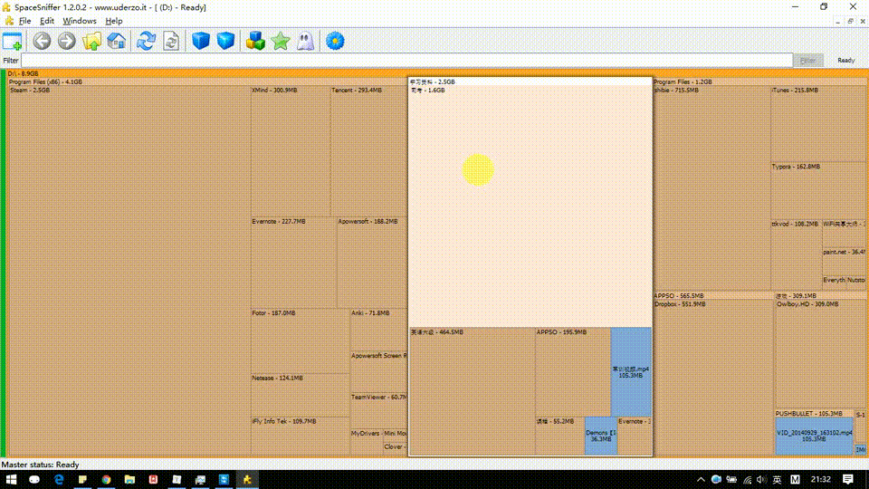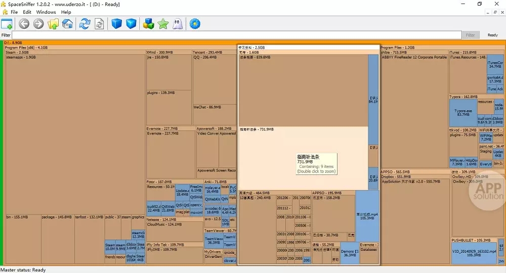 SpaceSniffer是一个可以让您硬盘中文件和文件夹的分布情况的应用程序。通过使用TreeMap的可视化布局,你可以直观地看到在你硬盘上大的文件和文件夹。