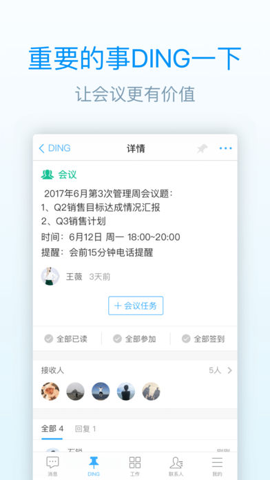 【DING信息必达】:重要的事可以发送语音/文字DING,通过电话或短信100%送达;