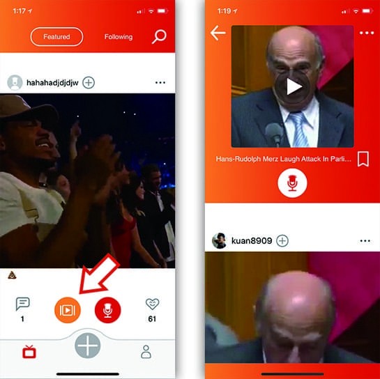 打开 Madlipz 後,可以看到中间有一个类似时间轴的介面,往下滑动就可以看到大家制作的 Madlipz 配音影片: