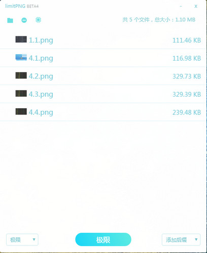 limitPNG 有“快速”、“强力”、“极限” 3 级压缩模式可选。极限压缩会花费大量时间,如果你没那个耐心可以选择“快速”模式。 快速模式通常已经能达到极限效果的 90%,而花费时间只要“极限”模式的 20 分之一甚至更少。 当然为了追求最后 10% 的压缩效果,多花一些时间也是值得的,而其中的取舍由你决定。