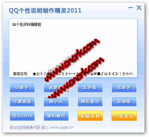 QQ个性说明制作精灵 V2.5 简体中文绿色免费版 这款qq个性说明(又称qq个人资料)制作工具自带10余款由文字和符号组成的个性图案,方便大家加以修改后,设计成自己喜欢的图案样式,用于qq个人说明中,向好友展示个性的qq资料。查看100多款已设计好的成品请访问http://www.qqpk.cn/site/zl/ ,qq2010中个人说明的修改方法是:先点击自己头像进入“我的资料”设置,点击左侧的”更多资料“即可对个人说明进行修改了。