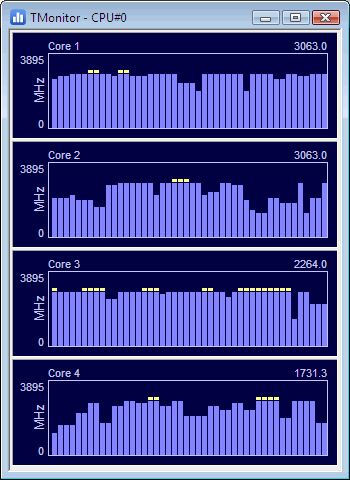 CPUID TMonitor V1.04.0 英文绿色免费版 CPUID TMonitor界面比较简单 ,TMonitor通过柱状图显示CPU每个核心的实时频率变化(刷新频率为每秒20次)。另外,可支持Turbo Boost技术的CPU,提升频率数据则以黄色表示。软件界面还能够切换为实时显示CPU的倍频变化情况