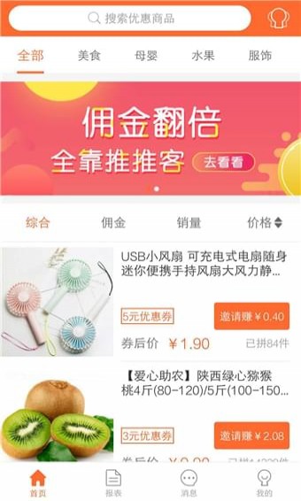 推推客APP以推广拼多多内部优惠券为切入点的推广平台,也就是说你可以通过这个平台分享拼多多优惠券,分享赚钱,也可以通过发展你周边的小伙伴成为合伙人,赚取奖励。