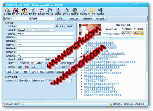 论坛监管大师 V1.4 简体中文绿色免费版 论坛监管大师适用于discuz和phpwind论坛站长的多论坛多版本管理软件。软件可快速提升论坛人气、精准设置虚拟在线,批量注册,设置和调用马甲发帖,顶贴。论坛帖子监控,有效防止广告,智能回帖消除零回复。强大的论坛数据库管理使得数据库备份、优化、整理、修复等轻松搞定。