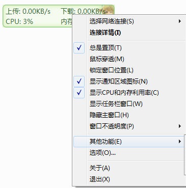 显示当前实现网络传输速率、CPU和内存占用率如果电脑有多个网卡,支持自动和手动选择网络连接
