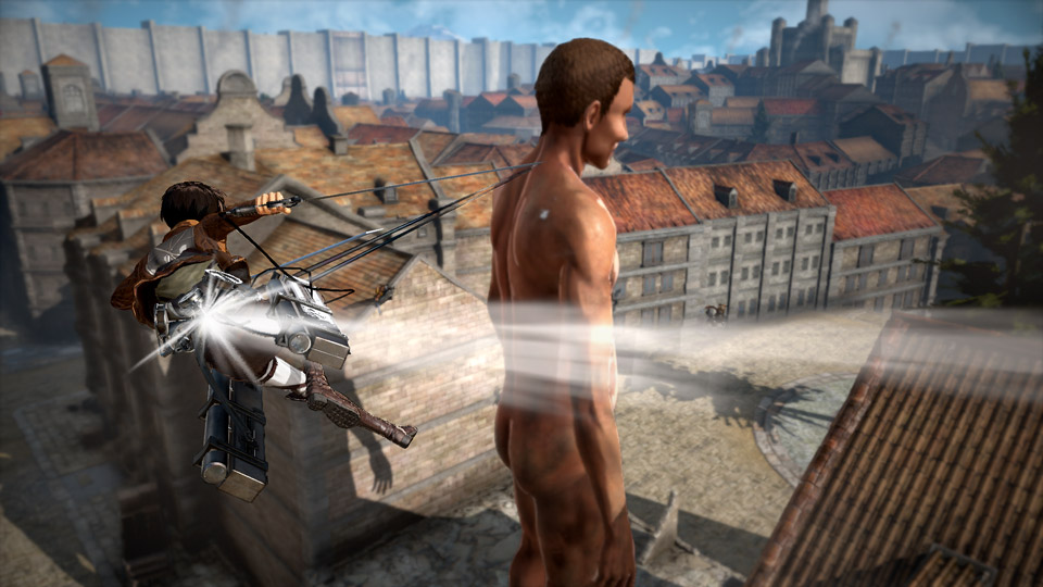 4、警戒度&危险区域:本作的巨人有着「警戒度」的概念,当玩家接近巨人时,巨人会提高警戒度。警戒度达到最大之后,就会变成「危险区域」。巨人会锁定玩家,一边大肆破坏周围的建筑物一边以猛烈的声势袭击而来。逃跑一段时间,或使用闪光弹,可解除危险区域。