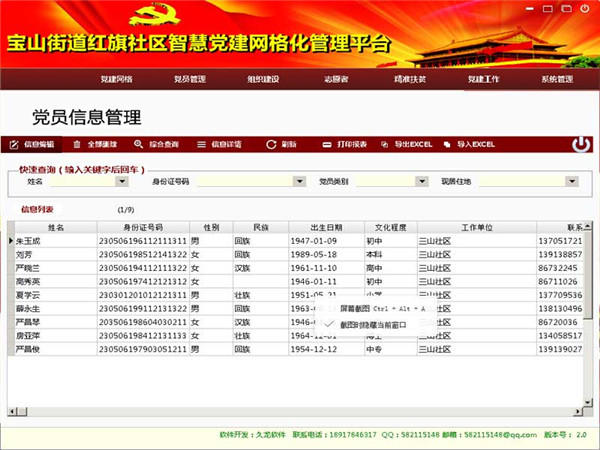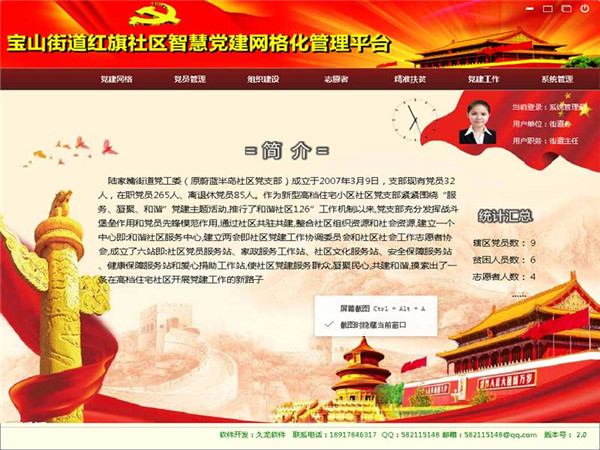《智慧党建网格化管理平台》是按照网格化管理的要求,将现代信息技术融入基层党务工作的管理,提高基层党务工作质量和效率,使党务工作管理人性化、精确化。本软件适用范围:街道党工委、乡镇党委、社区党支部、村党支部等基层党组织。简单易用、智能高效是软件的特点!用户无需复杂的操作、甚至可以很少打字,只需指指点点就可以高效快速的完成复杂的管理工作。信息采集除非必须键盘输入,全部实现智能导入、鼠标点选录入,最大程度的提高了工作效率。