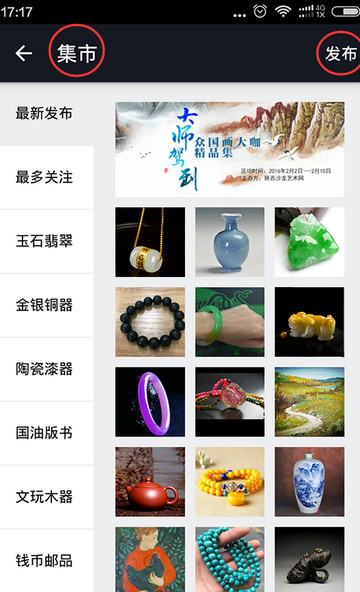 独家支持手机实时拍卖古玩的软件!【集市】是古玩收藏爱好者的捡漏乐园。一键摆摊,全景橱窗等功能,让您彻底摆脱古玩店租金贵、手续多、城管烦的尴尬处境,买卖双方异地交流、随时联络,收藏拍卖与艺术生活两不误!