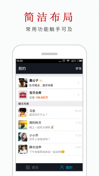 进入我的,可以看到个人资料编辑栏,“宝贝仓库”是每个人添加宝贝的地方,添加足够宝贝后,就可以在拍场、集市一键发布自己的专场拍卖,还可以和好友聊天交友。