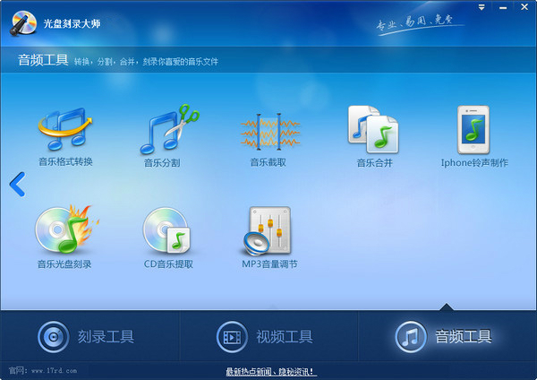一、刻录工具:采用先进的防烧死技术,刻录快速又稳定。二、音频工具:转换、分割、合并,刻录你喜爱的音乐文件。