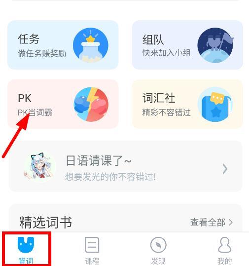 2. 点击首页【背词】中的【PK】选项。