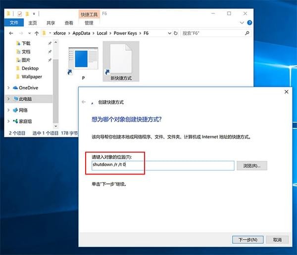 想要实现执行命令,比如 F6 + R 重启电脑,那么在 F6+回车 弹出的目录下,右键点新建快捷方式,其对象位置填写为关机命令:shutdown /r /t 0,然后再将这个快捷键改名为 R 即可。想执行其他命令也都是一样,你还可以执行更加复杂的 .bat 批处理;或者,在“对象位置里填写网址”就能打开指定的网站。