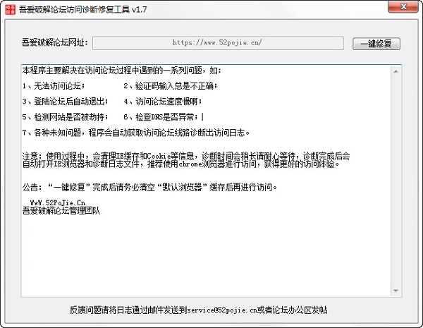 我的小伙伴们!!你们是不是还在为访问不了论坛而捉急?有没有遇到输入验证码死活都不对?终于登陆论坛后又坑爹的自动退出?前面问题都解决能访问了速度慢的跟蜗牛似的,是不是想死的心都有了?没关系,小伙伴们,你们有救啦!!!大家期待已久的吾爱破解论坛网络诊断修复工具隆重出炉,上述问题轻松修复,各种论坛疑难杂症统统秒杀,一键式修复无需过多操作,完整的修复日志帮助你了解具体问题出在哪里!【问题解决】