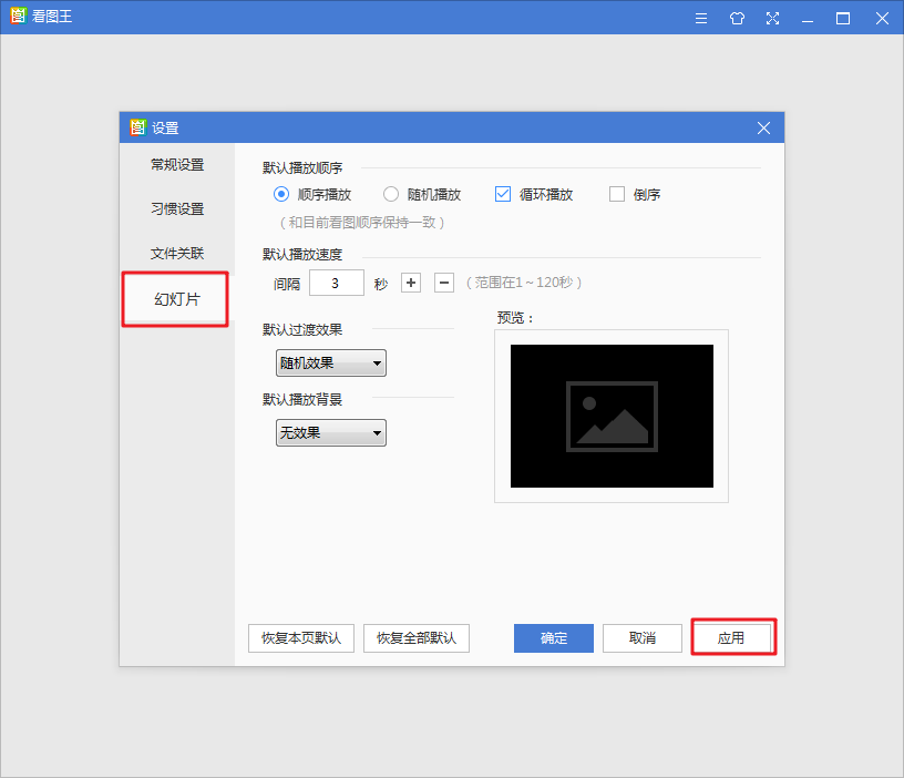 2、在弹出的设置窗口中选择“幻灯片”选项,在右侧的选项中选择播放效果,然后点“应用”即可