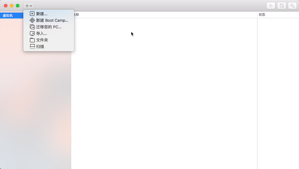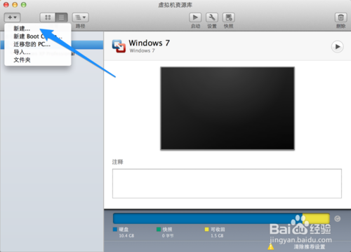 打开 Vmware Fusion 以后,在虚拟机资源库中,点击左上角的“+”按钮,再点击“新建”选项,如图所示