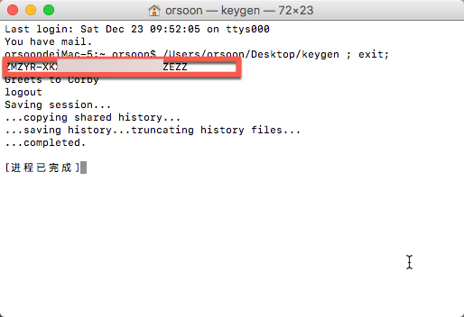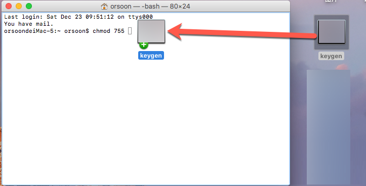 注意:如果软件包中的【keygen】密钥生成器图标显示为白色,那就需要在终端中运行一下。操作如下:先将【keygen】拖到桌面,然后打开终端,输入chmod 755 ,(chmod 755后面有空格);然后将桌面的【keygen】拖到chmod 755 后面,再按回车键,此时桌面的【keygen】图标显示为绿色正常颜色,即可打开使用了。