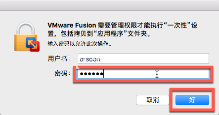 2、VMware Fusion 需要管理权限才能执行,输入你的Mac电脑开机密码,然后点击“好”。