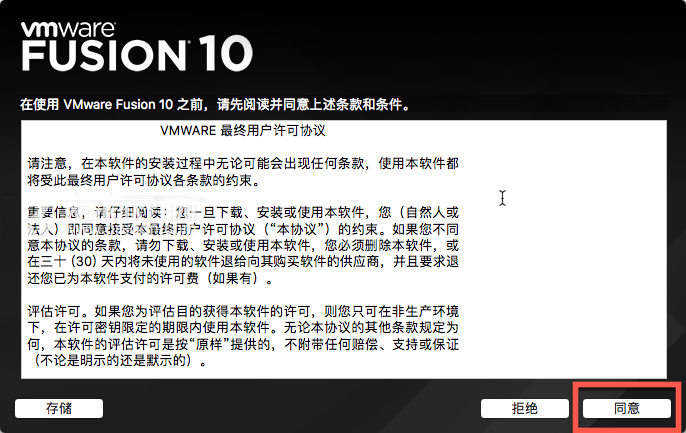 4、弹出VMware Fusion 10软件许可协议,点击“同意”。