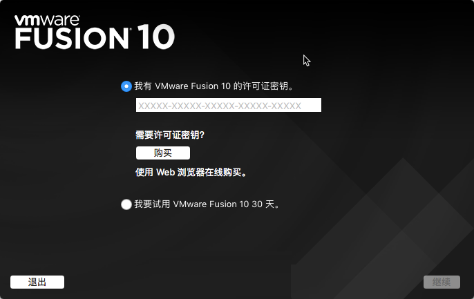 5、此时弹出一个VMware Fusion 10 注册界面。(先将此界面放置一边)