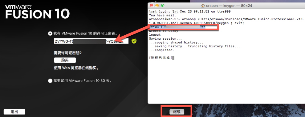 8、我们将生成的“VMware Fusion 10 密钥”复制到刚刚注册界面的对应位置,然后点击“继续”。