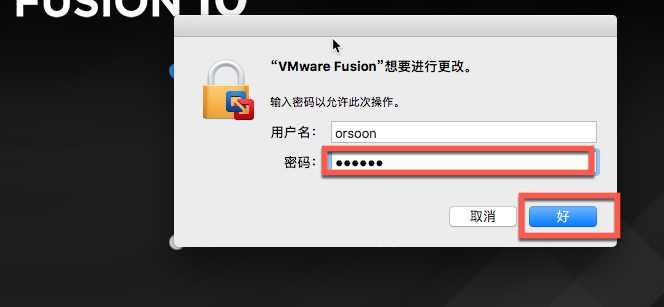 9、VMware Fusion 想要进行更改,输入您的Mac电脑开机密码。然后点击“好”。