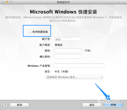接下来在快捷安装界面中,请取消“使用快捷安装”选项,点击“继续”按钮,如图所示