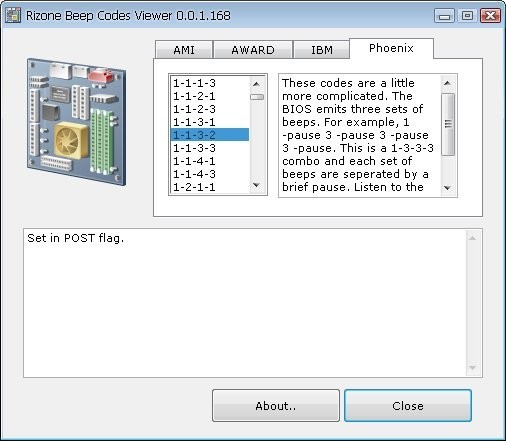 Beep Codes Viewer依照不同BIOS厂商分为AMI、AWARD、IBM与Phonix等4个分页,每个分页中都会列出各厂牌BIOS的不同故障音的组合,点击其中任何项目即可在下方列出可能的问题与解决方法。不过这款软件是英文的,可能需要你多花些时间去研究。