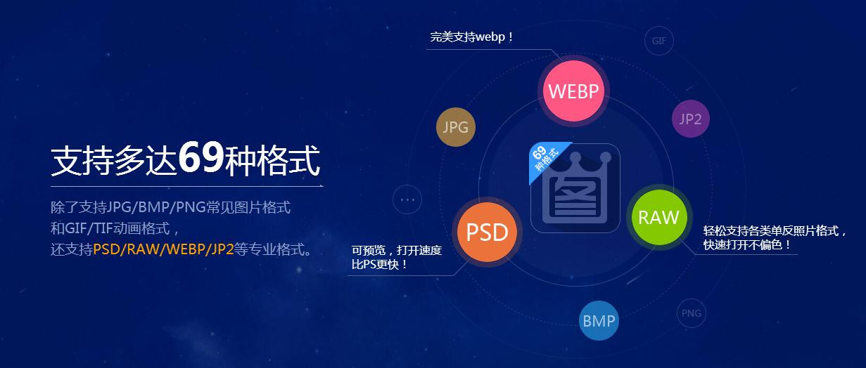 2345看图王比传统图片查看器支持更多的图片格式,除了BMP/PNG/JPG等常见图像格式,更兼容PSD/RAW等专业图像格式,多达69种;