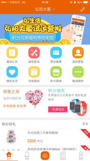 弘生活APP是弘阳集团为业主打造的一款移动社区服务软件,提供社区公告、设备报修、投诉建议、在线缴费、在线投票、积分商城、社交圈、便民服务、社区电商等全生活需求。