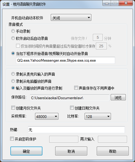 该软件能够自动对语音聊天及视频聊天进行录音,支持所有QQ,电脑版微信,及Skype等软件的自动录音。软件在开始聊天时自动开始录音,并在挂断聊天时自动停止录音,并将双方的声音以MP3格式进行保存。即使在聊天时,戴着耳机,该软件也能够将双方的声音清晰地录制下来。因为任意聊天软件在开始语音(或视频)聊天时,软件会调用底层的相关函数,本软件能够拦截到该函数的调用从而自动识别到现在正在开始语音,因此本软件会在此时自动启动录音功能,在结束聊天时,同样本软件能够自动侦测到此动作,从而自动停止录音,并将双方的声音进行自动存储。该软件支持所有的聊天软件,软件已经将QQ,Skype及Yahoo Messenger的进程名添加在了软件中,如果需要对电脑版微信进行自动录音的话,需要将电脑版微信的进程名WeChat.exe添加到软件的设置窗口中。【模式介绍】