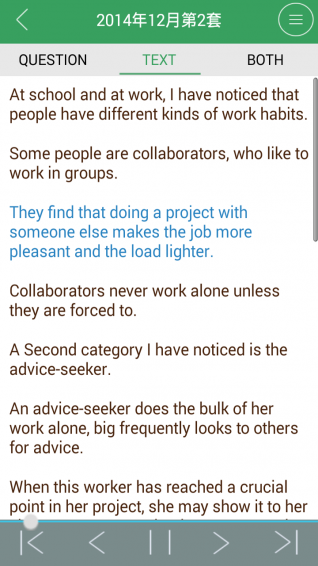 米考试,云考试备考学习与交流平台。包括四六级听力,46级阅读,托福听力阅读等!本应用包含:2006年06月-2015年06月英语六级真题听力,每套真题听力包括:短对话,长对话,短文听力和复合式听写四项。每项均含有题目选项、音频、听力原文并提供的权威详解,给你最真实的考场体验。